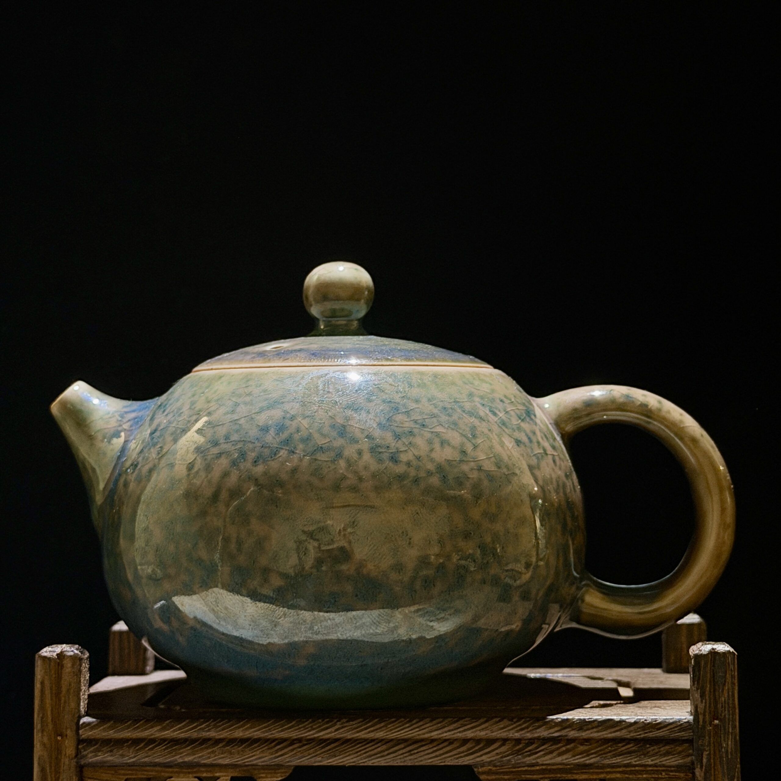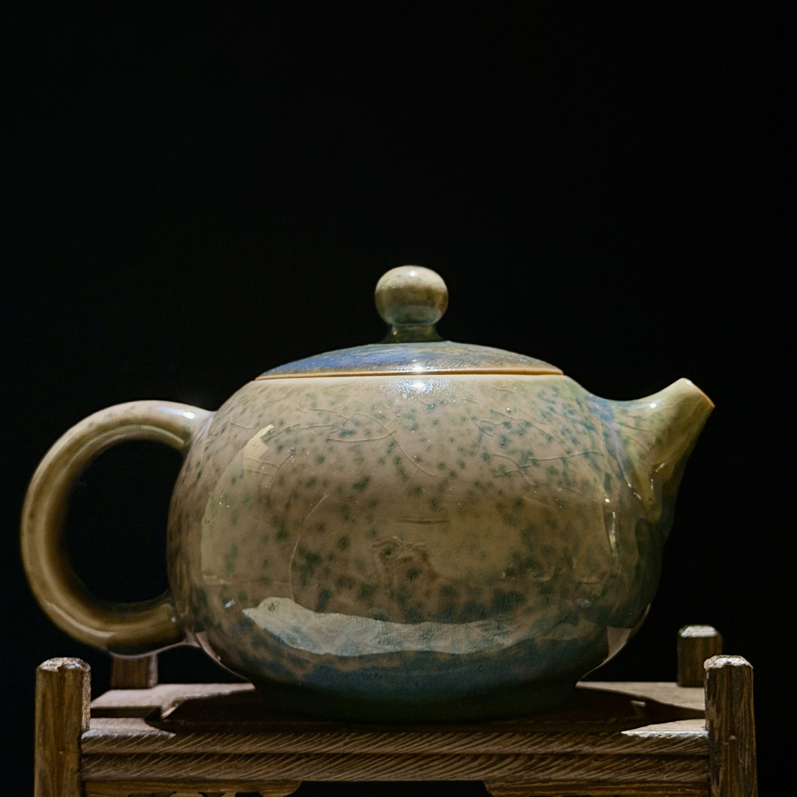 Every curve is shaped by the potter’s fingers—from the plump, rounded body that mirrors the soft contours of Yunnan’s rolling hills, to the delicate spout and looped handle that fit perfectly in hand, designed for the graceful pour of a traditional tea ceremony. The glaze is a masterpiece of nature: a gradient of creamy beige and mossy green, crisscrossed with fine crackle lines that evoke the misty valleys and ancient tea terraces of the highlands. No two pieces are identical; each bears the unique fingerprint of the kiln’s flames and the artisan’s touch.
