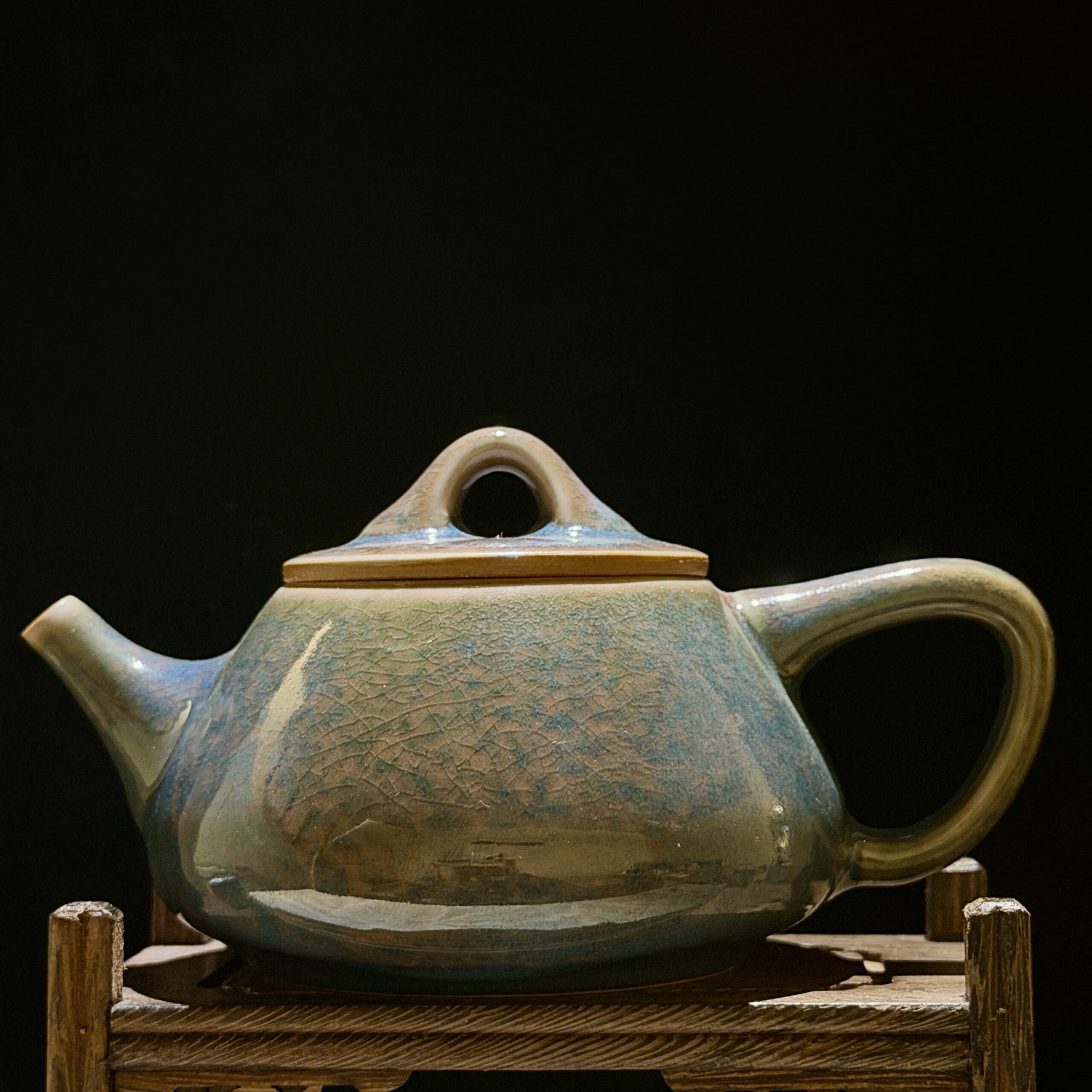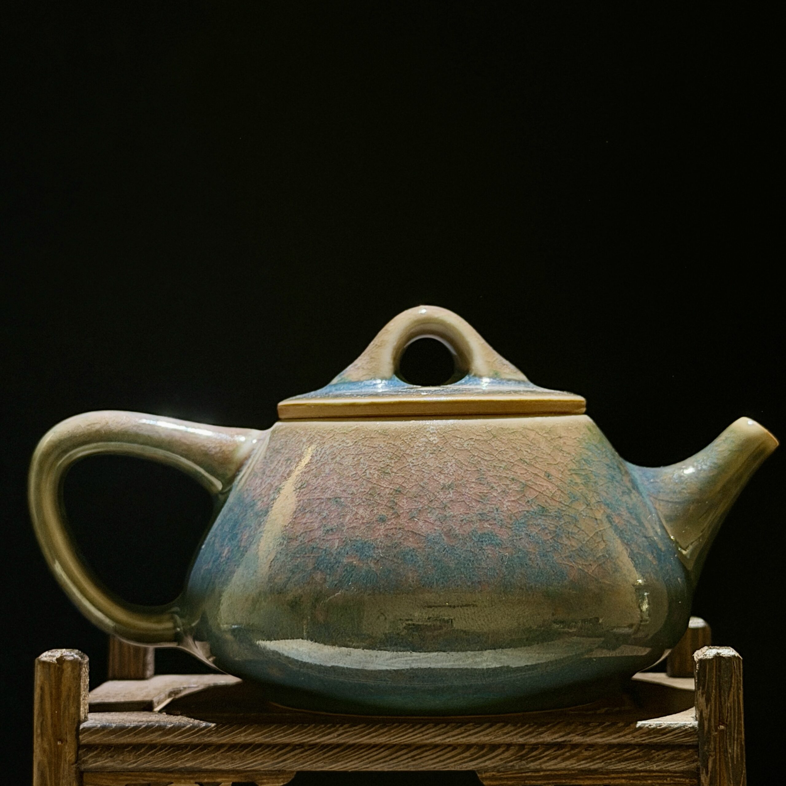 Every curve is shaped by the potter’s fingers—from the robust, angular body that mirrors the jagged contours of Yunnan’s snow-capped peaks, to the arched bridge handle and short, stout spout designed for a steady, graceful pour. The glaze is a masterpiece of nature: a gradient of earthy pink and mossy green, crisscrossed with fine crackle lines that evoke the weathered rock faces of the highlands, where ice and sun have carved patterns into stone for centuries. No two pieces are identical; each bears the unique fingerprint of the kiln’s flames and the artisan’s touch.