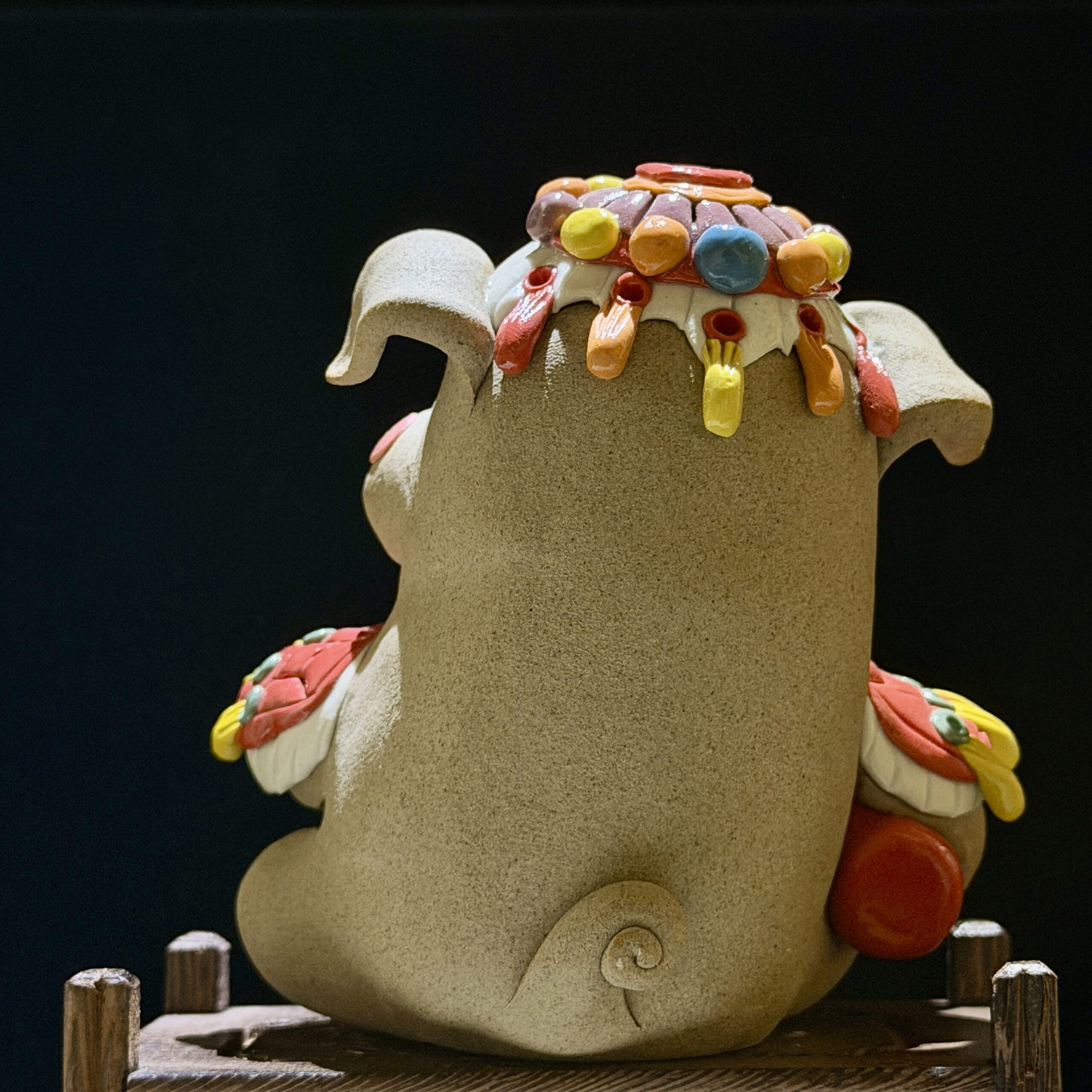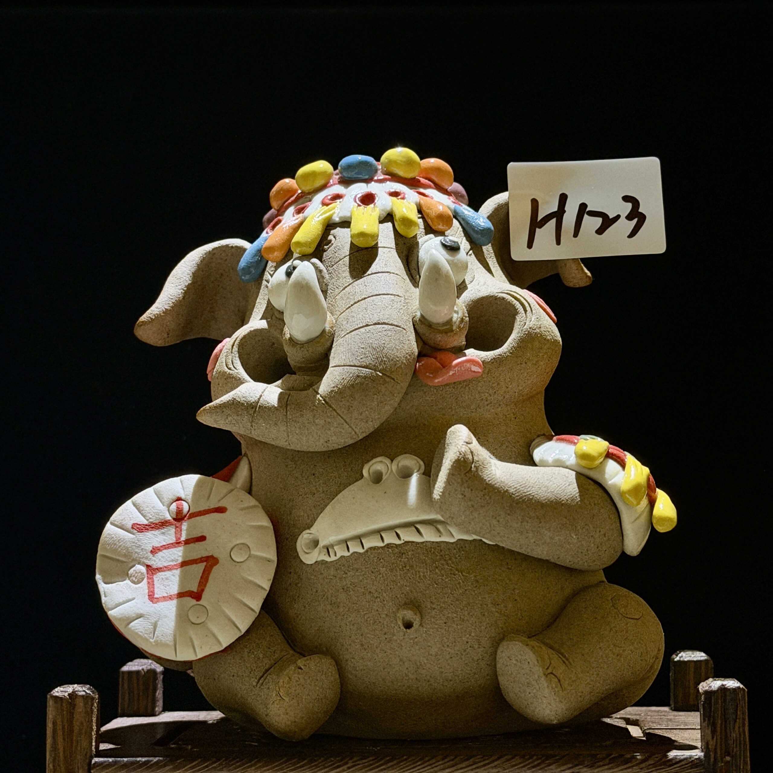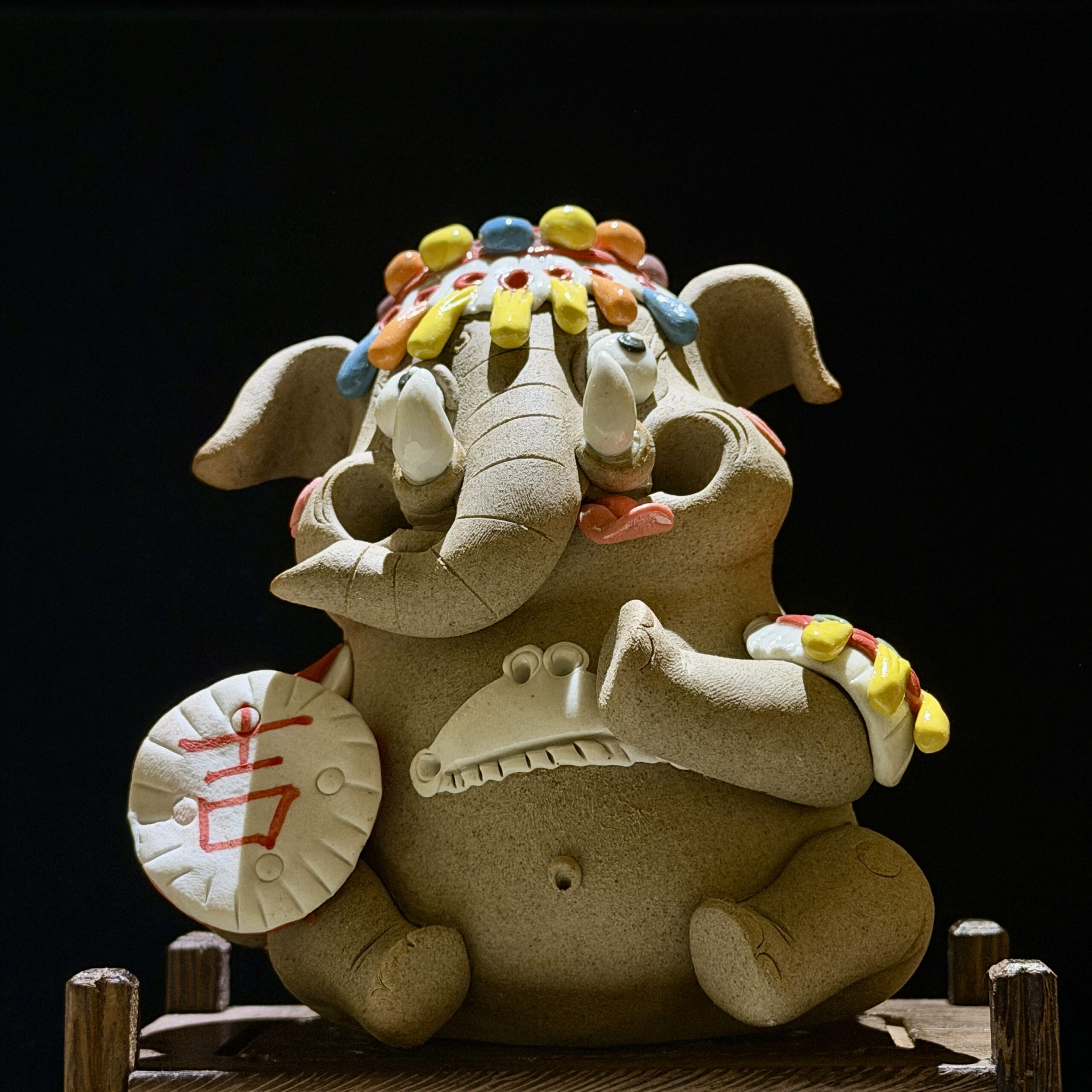 Every detail is meticulously shaped by hand: the rough, earthy ceramic body, the playful curled trunk, and the vibrant, colorful headdress that echoes the festive folk art of Yunnan. The elephant holds a round plaque inscribed with the Chinese character 吉 (Ji), meaning “good luck,” making it a heartfelt wish for prosperity and happiness.